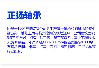 始建于1994年的ZYZ公司是生產(chǎn)滾子軸承和球軸承的專業(yè)制造商,地處上海與杭州之間的錢塘江畔。公司建筑面積3.5萬(wàn)平方米,擁有4個(gè)廠?區(qū),員工500名,其中工程技術(shù)人員30余名。年產(chǎn)外徑Φ30-360mm的各類軸承1000余萬(wàn)套,為電機(jī)、卡車、汽車、農(nóng)機(jī)、精密機(jī)床、工程機(jī)械等行業(yè)配套。